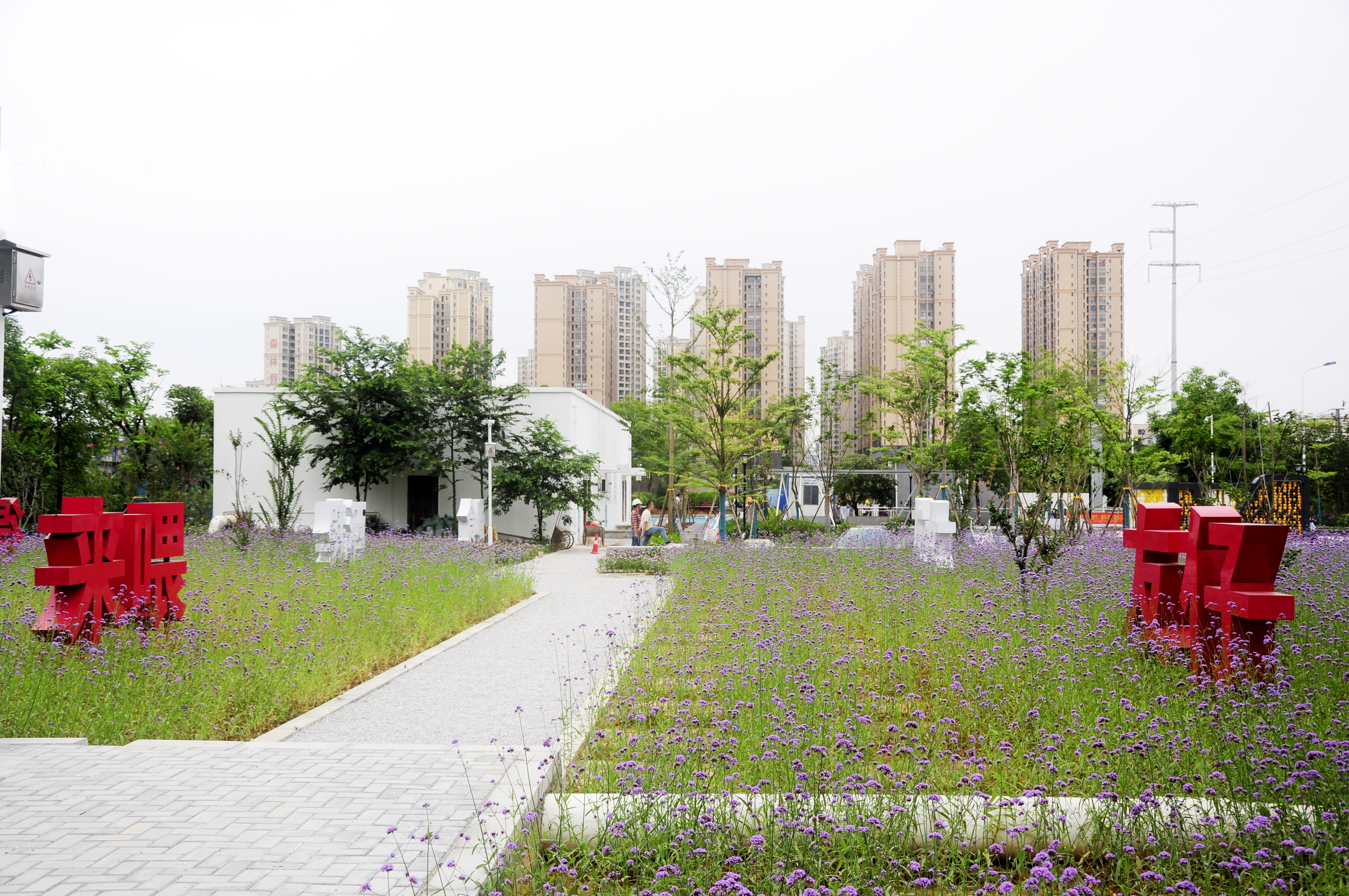 南面則設立美德廣場,沿市政道路一側完全鋪開,作為廣場方便居民進入,同時通過臺階來解決場地原有高差。組合的綠化花池可阻隔城市干道的噪音粉塵干擾,花蔓廊架為居民提供短暫休憩、遮陰的空間,兼顧使用者對活動廣場的觀看功能,形成了一個活動空間與看臺的共同體。雕刻中華傳統(tǒng)美德的地雕將文明新風尚融入百姓生活,塑造活力而溫暖的社區(qū)生活場景。