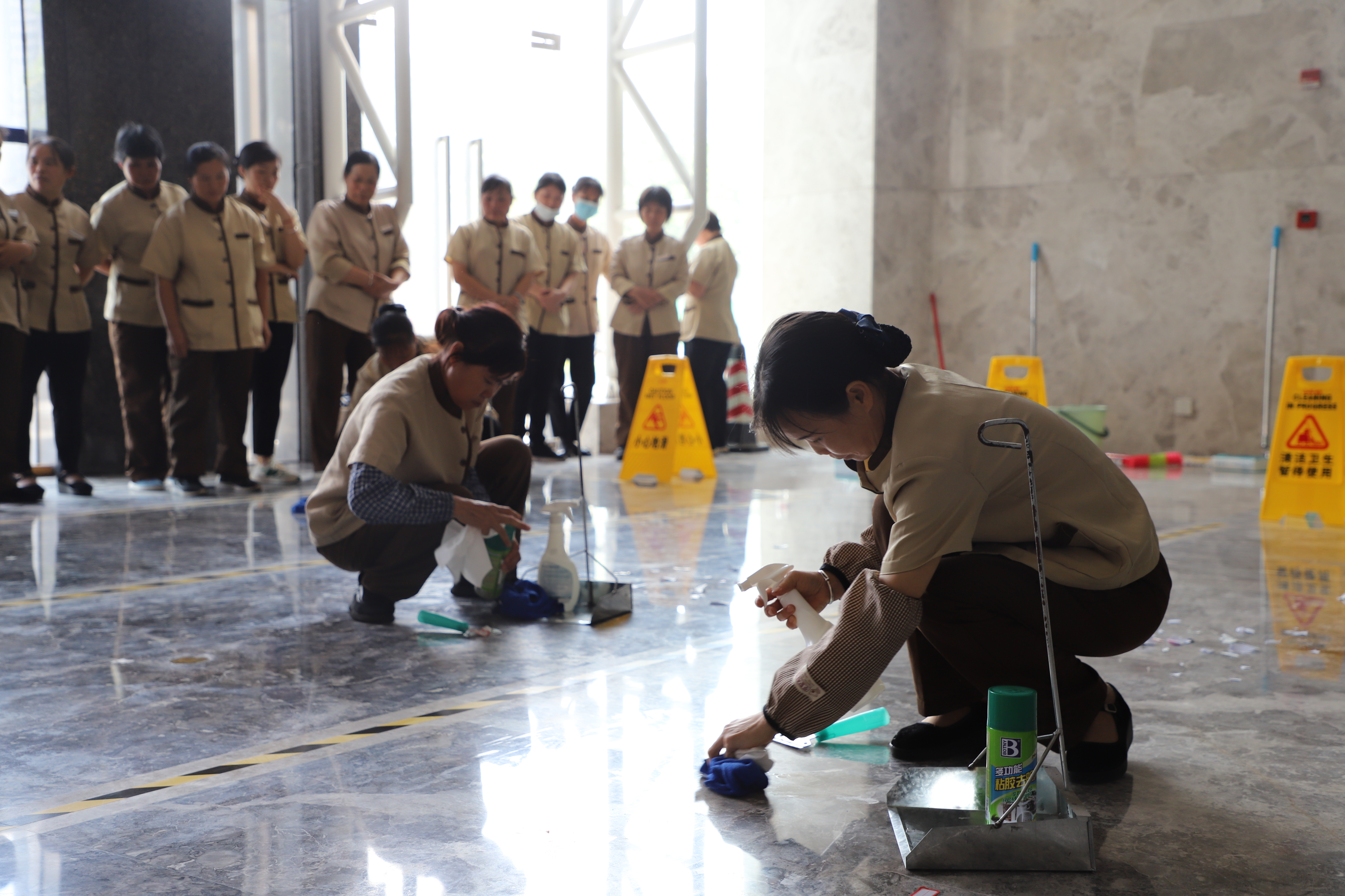 在她們的一雙巧手下地板煥然一新,充分展現(xiàn)了萬方保潔人員的專業(yè)風采。